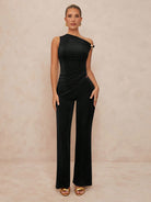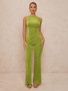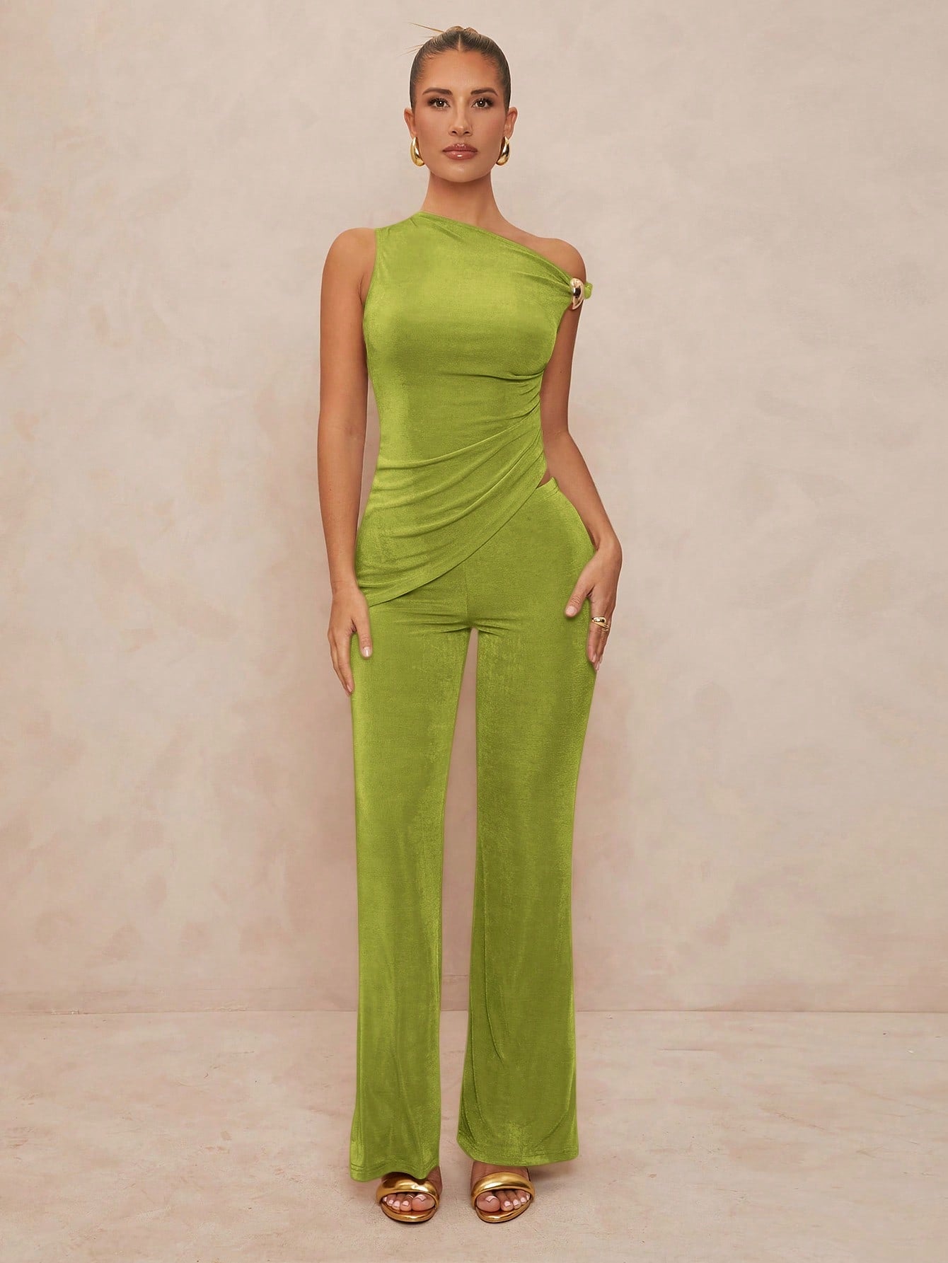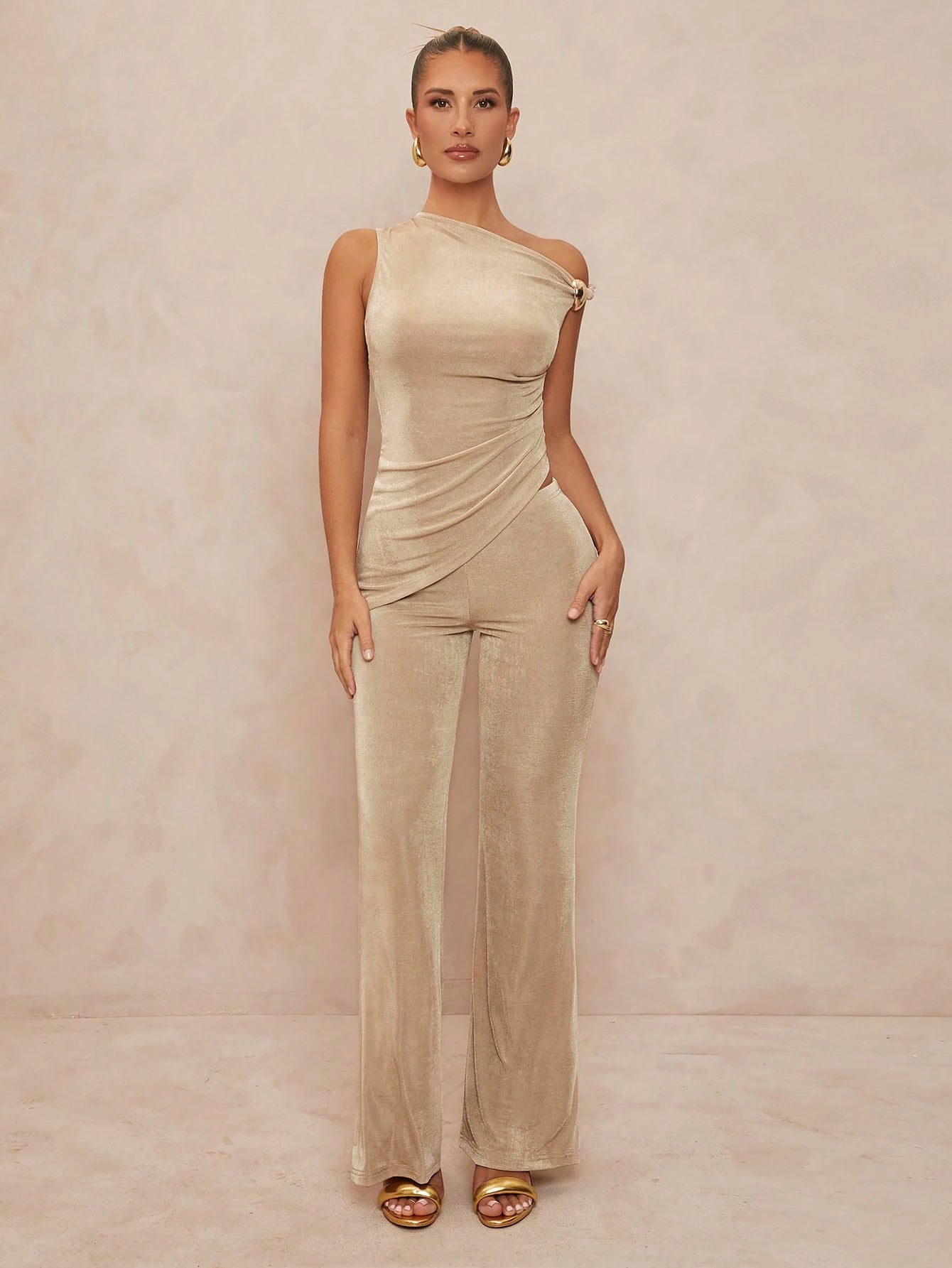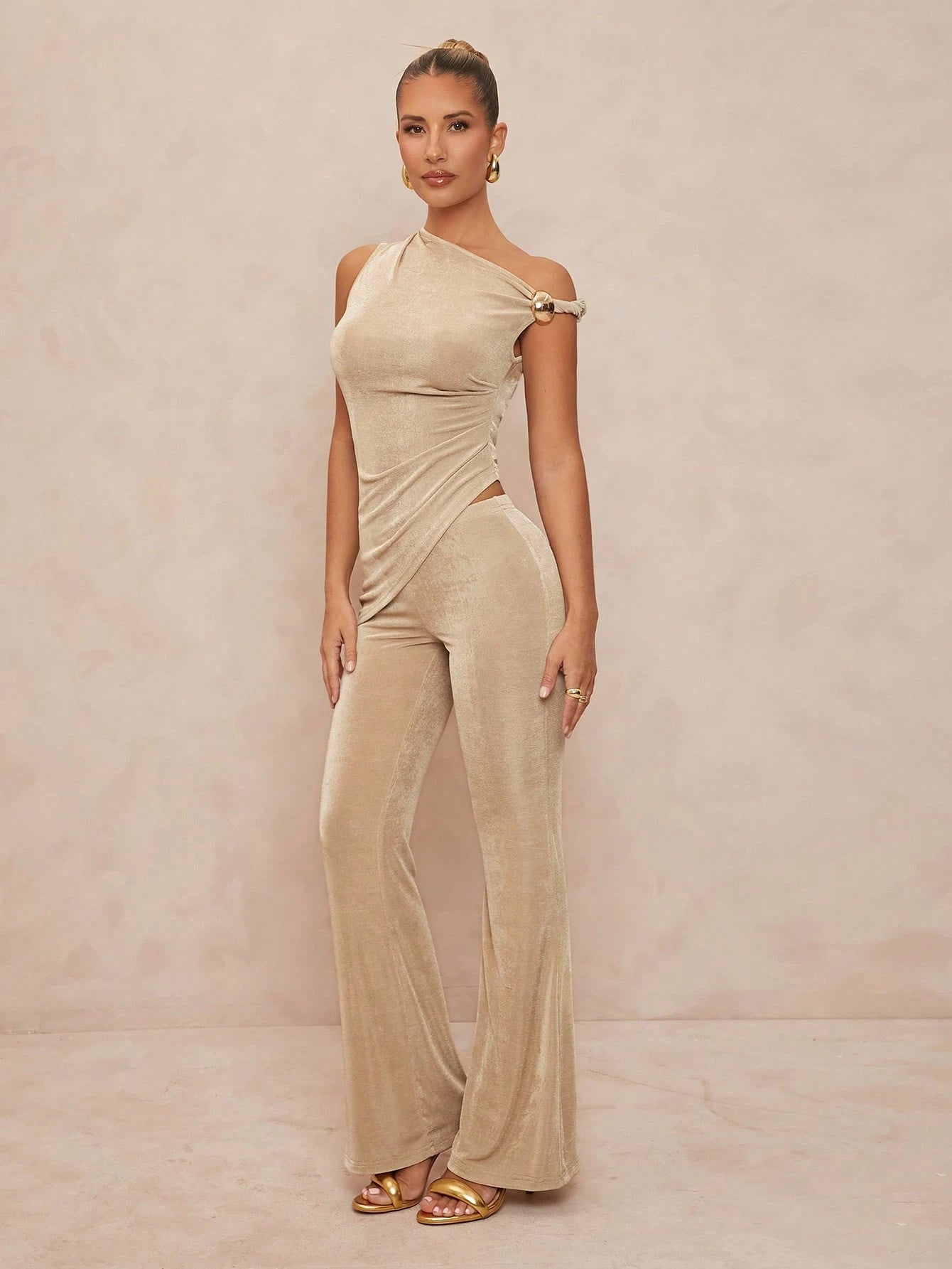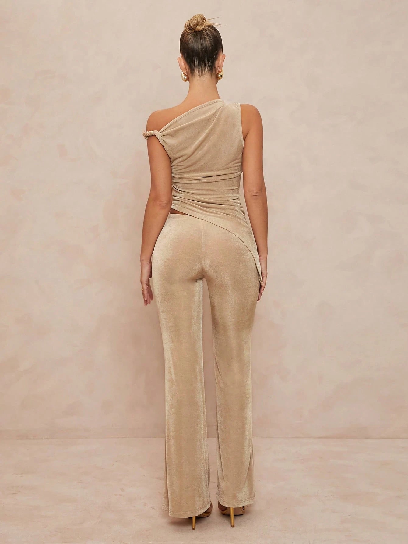 ELEVATED DESIGN: Asymmetric bodycon top paired with elegant wide-leg trousers