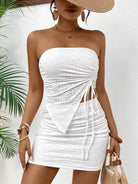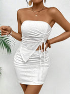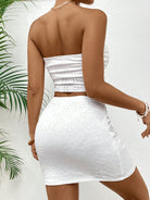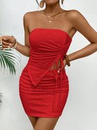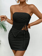 Chic Design: The Luxe™ Mirage Set includes a solid color knitted asymmetric strapless top and a matching skirt, showcasing modern elegance with a unique twist.